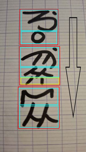 - Sur la partie supérieure du caractère, la première consonne suivie de la première glissante de la syllabe